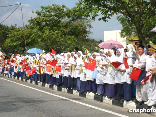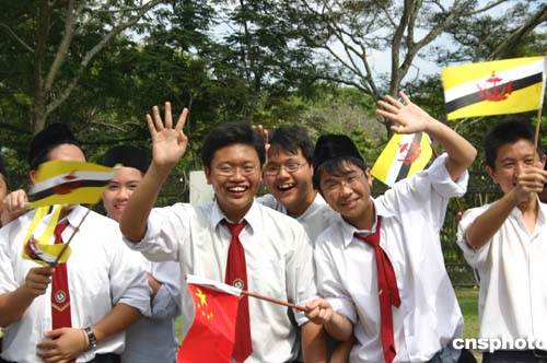 4月20日,文萊中學(xué)生王宮外列隊(duì)歡迎中國國家主席胡錦濤到訪。作者:李靜