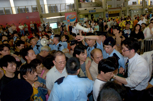 昨上午十時四十五分已有數(shù)百名馬迷輪候換取,至十一時零五分,懷疑有十多名馬迷不守秩序,插隊(duì)搶帽引起混亂,雖然在場警員架起“鐵馬”控制場面。其后,人群再爭相索取,甚至推翻鐵欄,多人跌倒受傷,場面失控,F(xiàn)場所見,部分用作分隔人群的鐵欄被壓至變形。