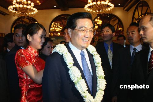 四月二十八日,中國(guó)國(guó)家主席胡錦濤在馬尼拉出席菲律賓華人各界歡迎會(huì),接受華人敬獻(xiàn)的茉莉花環(huán)。作者:李靜