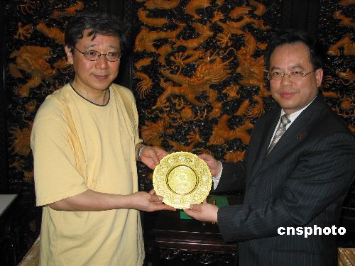 中新社東京五月一日電 今天中午十二點整,來自日本橫濱的公司職員近藤英男高興地從愛知世博會中國館館長孫鋼手里接過一面紀念金盤,他幸運地成為中國館自三月二十五日開館以來接待的第一百萬位觀眾。