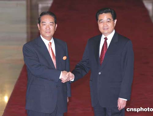 下午3時(shí)許,中共中央總書(shū)記胡錦濤與親民黨主席宋楚瑜在北京人民大會(huì)堂北大廳握手。隨后,胡錦濤會(huì)見(jiàn)了宋楚瑜。