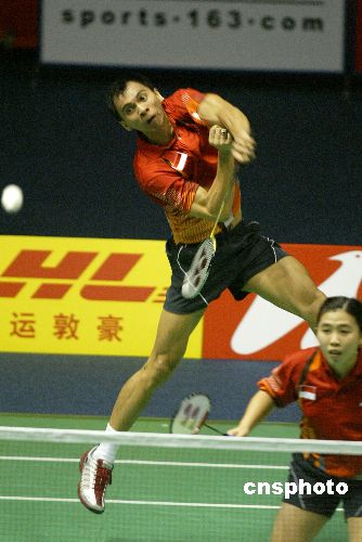 五月十二日,在北京首都體育館進(jìn)行的第九屆蘇迪曼杯世界羽毛球混合團(tuán)體錦標(biāo)賽大戰(zhàn)進(jìn)入了第三天,中國隊與印度尼西亞隊交鋒,在首場的混合雙打的比賽中,印度尼西亞組合林培雷、尤·泰蒂一比二不敵中國組合張軍、高崚。