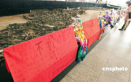 日本侵略者這種滅絕人性的殺戮行徑,令人神共憤,不僅讓中國人民刻骨銘心,也讓世界和平與正義人士義憤填膺。在“平頂山慘案紀(jì)念館”內(nèi),記者看到了許許多多來自日本的千紙鶴懸掛在遇難者遺骸的四周,這是日本“東日本鐵路工會(huì)代表團(tuán)”等等那些日本和平正義人士敬獻(xiàn)給這些無辜遇難者冤魂的!捌巾斏綉K案紀(jì)念館”館長肖景全告訴記者,“平頂山慘案”遺址自上世紀(jì)七十年代開挖以來便不斷有日本游客前來參觀。三十多年來,已有數(shù)十萬人次日本人到撫順參觀“平頂山慘案”遺址紀(jì)念館。每一位目睹“慘案遺址”的參觀者,面對(duì)累累白骨,無不為當(dāng)年日軍的殘暴所震驚。(完)