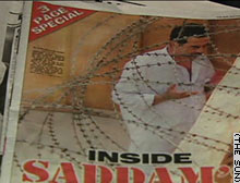 盡管《太陽(yáng)報(bào)》21日沒(méi)有將薩達(dá)姆的照片等在封面,但也作了顯著導(dǎo)讀標(biāo)識(shí)。新刊登的大彩照顯示,身著白色長(zhǎng)袍的薩達(dá)姆站在有刺鐵絲網(wǎng)后面,手掌張開(kāi)頭微低,像是在做禱告,也有人將其解讀為正在散步,并且在同什么人交談。