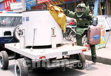 昨日7時(shí)許,武漢順道街車(chē)站旁出現(xiàn)一只可疑皮箱,10時(shí)許,警方趕到并封鎖現(xiàn)場(chǎng)。排爆特警隨后趕到,厚厚的防護(hù)服剛穿上身,就出現(xiàn)一陣騷動(dòng)——10余群眾一窩蜂沖向距皮箱不到5米處“看稀奇”。附近民警迅速上前阻止圍觀者,剛穿好防護(hù)服的特警趁機(jī)沖向皮箱,快速將皮箱裝進(jìn)排爆罐,并立即拖離現(xiàn)場(chǎng)。(王蕾)