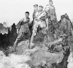 1941年8月,侵華日軍華北方面軍調集7萬余人的兵力,對晉察冀邊區(qū)所屬的北岳、平西根據地進行毀滅性“大掃蕩”。9月25日,日偽軍約3500余人圍攻易縣城西南的狼牙山地區(qū),企圖殲滅該地區(qū)的八路軍和地方黨政機關。晉察冀軍區(qū)第1軍分區(qū)某部第7連奉命掩護黨政機關、部隊和群眾轉移。完成任務撤離時,留下第6班馬寶玉等5名戰(zhàn)士擔負后衛(wèi)阻擊,掩護全連轉移。他們堅定沉著,利用有利地形,奮勇還擊,打退日偽軍多次進攻,斃傷90余人。次日,為了不讓日偽軍發(fā)現連隊轉移方向,他們邊打邊撤,將日偽軍引向狼牙山棋盤陀峰頂絕路。日偽軍誤認咬住了八路軍主力,遂發(fā)起猛攻。5位戰(zhàn)士臨危不懼,英勇阻擊,子彈打光后,用石塊還擊,一直堅持戰(zhàn)斗到日落。面對步步逼近的日偽軍,他們寧死不屈,毀掉槍支,義無反顧,縱身跳下數十丈深的懸崖。馬寶玉、胡德林、胡福才壯烈殉國;葛振林、宋學義被山腰樹枝掛住,幸免于難。