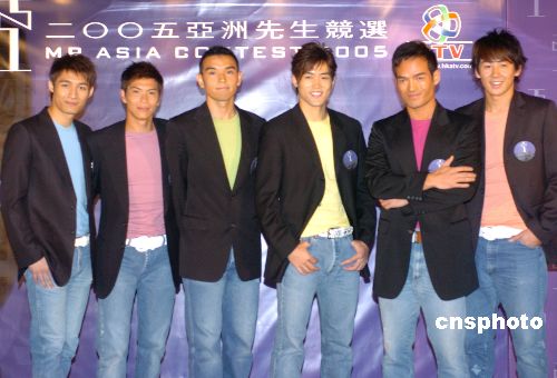 參加《2005亞洲先生競選》的中國香港賽區(qū)的三位參賽者(左)與中國國內賽區(qū)的三位參賽者(右)24日在香港亮相。作者:趙振清