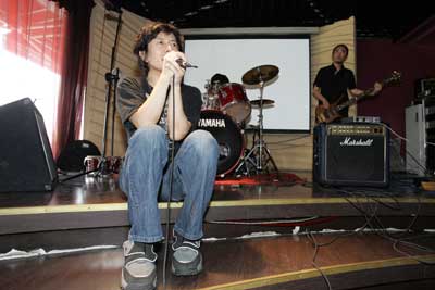在女人街的一酒吧內(nèi),燙著卷發(fā)的鄭鈞神采奕奕地出現(xiàn)在記者面前。不過這一回他不得不坐在地上排練了:“我前天去爬山,爬了7個(gè)鐘頭啊,下山的時(shí)候腿受傷了,現(xiàn)在下樓梯都不能彎!编嶁x向記者們“展示”了他的搖滾版《喀秋莎》。