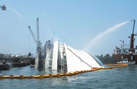 30日凌晨零時許,船體又見火舌,黑夜中大火吞噬船只,郵輪傾斜漸趨嚴(yán)重,凌晨4時30分左右燒得焦黑的煙囪撞擊在碼頭上,船身呈90度傾斜,右側(cè)整個坐在海床上。