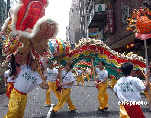 7月1日,為慶祝香港回歸八周年,由19個團(tuán)體發(fā)起、超過800個團(tuán)體合辦《慶;貧w八周年和諧團(tuán)結(jié)創(chuàng)明天》大巡游,參與巡游的團(tuán)體在鬧市表演舞金龍助慶。作者:鄧慶樂