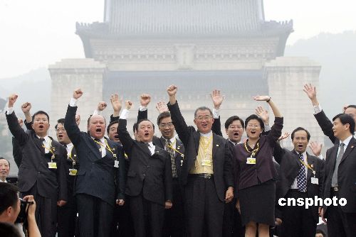 沿著三百九十二級臺階走下,郁慕明和訪問團成員不斷向周圍的人群揮手。走到中間,訪問團全體成員立定列隊,舉起右拳,反復(fù)高聲呼喊:“和平奮斗救中國!大家加油!”贏得南京市民一片熱烈的掌聲。