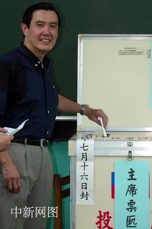 7月16日,中國國民黨主席選舉在全臺(tái)601個(gè)投票所展開。圖為1號(hào)參選人、臺(tái)北市長馬英九在居家附近的臺(tái)北興德小學(xué)參加投票。中新社記者 盛佳鵬