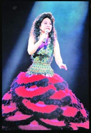小鳳姐在演唱會上每每都以大型傘裙特顯其纖腰。這條用羽毛做成的大型傘裙,顏色鮮艷,纖纖細腰表露無遺。