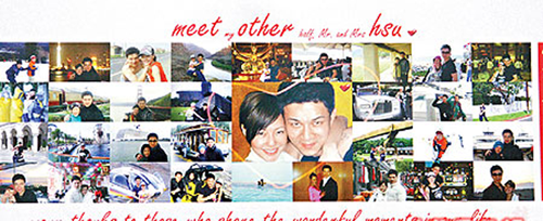 她的喜帖設(shè)計別致,中央有兩人臉頰相貼的心型圖案,上、下則寫有“meet my other half, Mr. and Mrs. hsu”(遇見我的另一半,許氏夫婦)和“many thanks to those who share the wonderful moments in our life”(非常感謝大家分享我們生命中的美好時光),照片場景包括滑雪與海中浮潛,季節(jié)有春、夏、秋、冬,每張兩人幾乎都是緊緊相擁,署名中她已自稱是許太太。