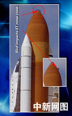 7月26日,美國“發(fā)現(xiàn)號”航天飛機從肯尼迪航天中心發(fā)射升空時,一只鳥在發(fā)射場附近飛過。當(dāng)天下午的新聞發(fā)布會上,美國宇航局提供的一幅電視圖片顯示,一只鳥可能在“發(fā)現(xiàn)號”航天飛機發(fā)射的時候撞擊了燃料箱的最前端部分。與此同時,美國宇航局證實,在26日的發(fā)射升空過程中,“發(fā)現(xiàn)號”上脫落下來一小塊隔熱瓦和一大塊碎片。“發(fā)現(xiàn)號”底部擋熱板可能有兩處遭到了破壞。
