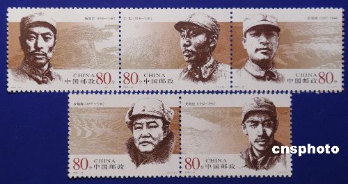 中國國家郵政局定于八月一日發(fā)行《人民軍隊早期將領》紀念郵票(一套五枚),特五枚郵票名稱分別為:楊靖宇(上排左一)、左權(上排左二)、彭雪楓(上排左三)、羅炳輝(下排左一)、關向應(下排左二),面值均為八十分。作者:鄒憲