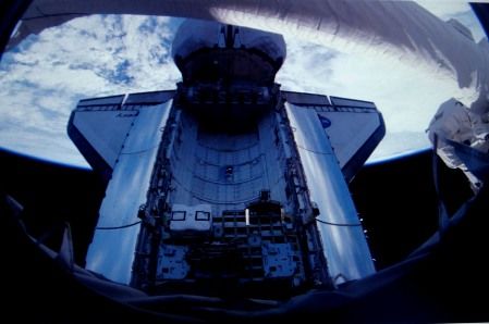 中新網(wǎng)洛杉磯八月一日電(記者 賈國榮)美國宇航局今天公布的最新太空圖片,展現(xiàn)太空中受傷的合金巨鳥----發(fā)現(xiàn)號航天飛機,和兩名宇航員完成第二次太空行走任務,回到艙位的奇特形象。