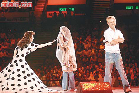 其后,小鳳姐工作人員把頭紗放在盧淑儀頭上,“命令”克勤站在女友身旁,然后把麥克風放在克勤嘴邊說:“你愿意嘛?”又以同一番話詢問盧淑儀:“你又愿意嘛?”全場觀眾無不拍爛手掌和叫囂,雖然小鳳姐一番好意,但克勤卻顯得尷尬萬分,對她說:“我一路自居不結婚的,這是在樂壇屹立多年的秘訣!
