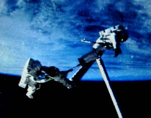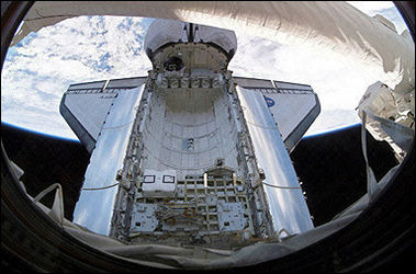 史蒂芬·羅賓遜在空間站機(jī)械臂協(xié)助下到達(dá)發(fā)現(xiàn)號(hào)前腹部,作了約五十分鐘的“太空手術(shù)”,順利清除隔熱瓷片縫隙凸起的填充材料。