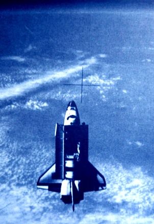 太空中飛翔的美國發(fā)現(xiàn)號航天飛機(jī)。