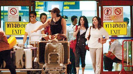 現(xiàn)場(chǎng)所見,王菲邊走邊把墨鏡移到頭上,神情疲累,一步出機(jī)場(chǎng)大門已急不及待煲煙提神,至于表情輕松的李亞鵬則全程戴上太陽(yáng)眼鏡,同樣點(diǎn)起香煙抽起來(lái),然后二人便站在街上等候尾隨友人推出行李車,其間王菲難掩倦意,頻頻打呵欠。眾人其后登上早已在場(chǎng)等候的車子,行李則存放在另一小型貨車上,一切打點(diǎn)妥當(dāng)后,司機(jī)便駕車直駛Banyan Tree五星級(jí)酒店。