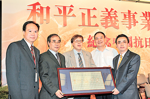 中新網(wǎng)8月11日電 中華全國集郵聯(lián)合會與海峽兩岸出版交流中心為紀(jì)念“和平正義事業(yè)的偉大勝利──紀(jì)念中國抗日戰(zhàn)爭暨世界反法西斯戰(zhàn)爭勝利六十周年展覽”,向展覽籌委會捐贈了名為《天下為公》的題詞郵票鏡屏。