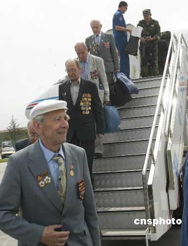 被邀請(qǐng)觀摩“和平使命—2005”中俄聯(lián)合軍事演習(xí)的俄羅斯十名蘇聯(lián)二戰(zhàn)時(shí)期老戰(zhàn)士,八月十九日踏上中國(guó)的土地。作者:王麗南