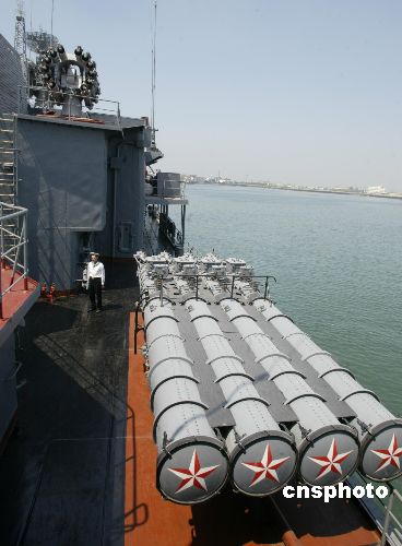 八月二十二日,中國(guó)部分媒體被俄軍方邀請(qǐng),參觀采訪此次參加演習(xí)的俄羅斯反潛艦,這艘?吭谇鄭u港的艦艇正整裝待發(fā),明日將起航參加海上封鎖演習(xí)。圖為反潛艦的一角。作者:王麗南