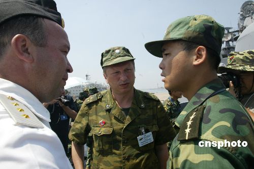 八月二十二日,一名中國(guó)軍官在參加演習(xí)的俄艦艇上為采訪者當(dāng)翻譯。據(jù)介紹,為方便中俄軍事演習(xí)語言的交流,中方調(diào)集大批懂俄文的軍官充當(dāng)翻譯。作者:王麗南