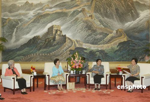 八月二十三日,全國(guó)人大常委會(huì)副委員長(zhǎng)顧秀蓮(右二)、國(guó)僑辦主任陳玉杰(右一)在北京人民大會(huì)堂會(huì)見(jiàn)美大地區(qū)華僑華人婦女代表團(tuán)。來(lái)自美洲、大洋洲八個(gè)國(guó)家的六十余名華僑華人婦女杰出人士是應(yīng)國(guó)務(wù)院僑辦的邀請(qǐng)來(lái)華訪問(wèn)的。作者:史利