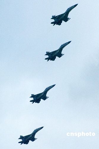 八月二十四日,“和平使命—2005”中俄聯合軍事演習第三階段兩棲登陸作戰(zhàn)實兵演練在山東半島展開。圖為參加兩棲登陸作戰(zhàn)實兵演練的中國空軍殲擊機四機編隊飛臨演習地域上空。作者:王麗南
