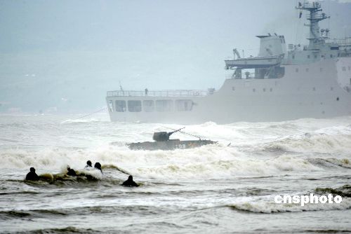 八月二十四日,“和平使命—2005”中俄聯(lián)合軍事演習(xí)兩棲登陸作戰(zhàn)實兵演練在山東半島如期進行。由于浪高風(fēng)急,一輛俄裝甲運兵車上的陸戰(zhàn)隊員被沖出車外,正向岸邊移動。作者:王麗南