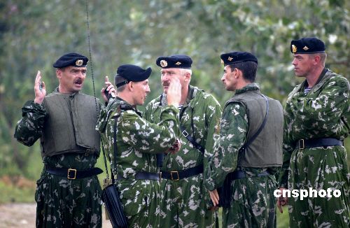 八月二十四日,“和平使命—2005”中俄聯(lián)合軍事演習兩棲登陸作戰(zhàn)實兵演練在山東半島如期進行。圖為完成登陸任務后的俄羅斯陸戰(zhàn)隊軍官,交流任務完成情況。作者:王麗南