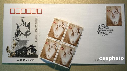 北京市郵票公司為配合國家郵政局于八月二十八日發(fā)行《中國電影誕辰一百周年》紀念郵票(一套一枚),特設(shè)計、印制了該郵票的首日封等郵品,并將于八月二十八日與郵票同時發(fā)行。郵票名稱為:中國電影誕辰一百周年,面值八十分。作者:鄒憲