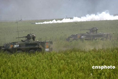 8月25日,參加強制隔離實兵演習的中方部隊裝甲戰(zhàn)車在煙障掩護下向目標發(fā)起攻擊。當日上午,“和平使命——2005”中俄聯(lián)合軍事演習最后一個戰(zhàn)術(shù)行動課目——強制隔離作戰(zhàn)演練在濟南軍區(qū)濰北靶場舉行。作者:王麗南