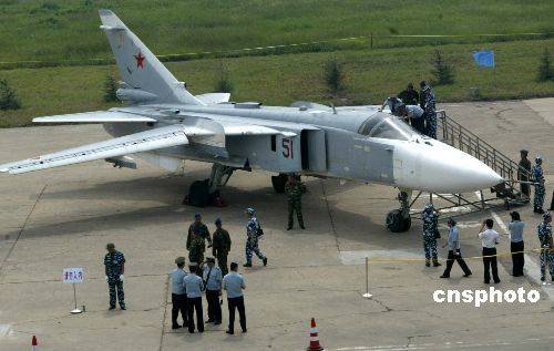 中新網(wǎng)8月26日電 26日上午,參加“和平使命-2005”中俄聯(lián)合軍事演習(xí)的俄羅斯空軍裝備在青島流亭機(jī)場進(jìn)行展示。中共中央政治局委員、中央軍委副主席、國務(wù)委員兼國防部長曹剛川觀看展覽。