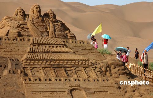 8月27日,幾名游客在欣賞沙雕作品。第二屆中國沙雕藝術(shù)節(jié)在新疆鄯善縣庫木塔格沙漠沙雕城開幕,共有12組反映新疆歷史文化、民風(fēng)民俗的沙雕作品向游人開放。作者:劉健