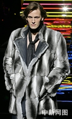 1月17日,在意大利米蘭舉行的2006/07秋冬男裝發(fā)布會(huì)上,一名模特在展示意大利設(shè)計(jì)師Carlo Pignatelli的作品。