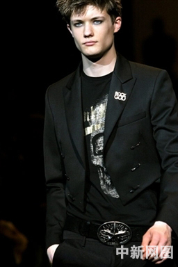 1月17日,在意大利米蘭舉行的2006/07秋冬男裝發(fā)布會上,一名模特在展示英國設計師John Richmond的作品。