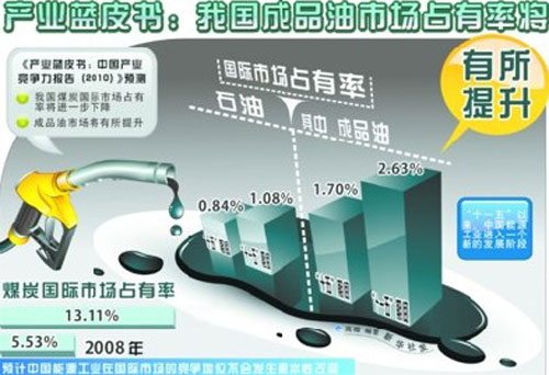 中國社會科學(xué)院22日在北京發(fā)布的《產(chǎn)業(yè)藍皮書:中國產(chǎn)業(yè)競爭力報告(2010)》預(yù)測,我國煤炭國際市場占有率將進一步下降,成品油市場將有所提升。