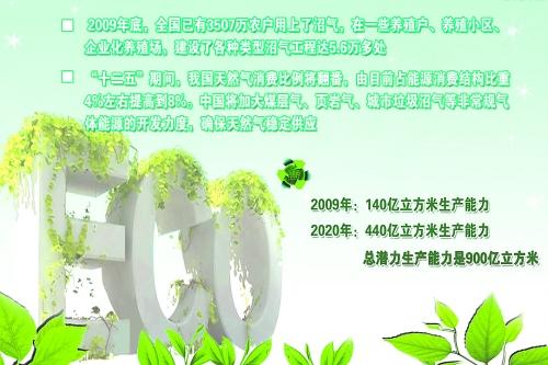 據(jù)悉,在進(jìn)入21世紀(jì)的10年間,我國(guó)政府對(duì)生物天然氣的投入高達(dá)240億元人民幣。2009年年底,全國(guó)已有3507萬(wàn)農(nóng)戶用上了沼氣,在一些養(yǎng)殖戶、養(yǎng)殖小區(qū)、企業(yè)化養(yǎng)殖場(chǎng),建設(shè)了各種類(lèi)型沼氣工程達(dá)5.6萬(wàn)多處,形成了每年140億立方米生產(chǎn)能力。中國(guó)已成為世界上沼氣發(fā)展速度最快、建設(shè)規(guī)模最大和涉及人群最多的國(guó)家。