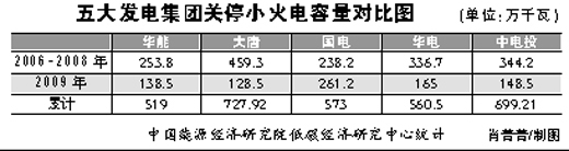 今年1月初,來自工業(yè)和信息化部的信息顯示,2009年全年關(guān)停小火電機組容量2617萬千瓦。去年電力行業(yè)的一件大事是“十一五”關(guān)停小火電的任務(wù)提前完成,小火電關(guān)停容量達(dá)到6006萬千瓦,30萬千瓦及以上火電機組占到了全部火電機組容量的64.46%。2007年,為實現(xiàn)“十一五”規(guī)劃綱要提出的單位國內(nèi)生產(chǎn)總值能源消耗降低和主要污染物排放總量減少的目標(biāo),國家發(fā)改委頒布了《關(guān)于加快關(guān)停小火電機組的若干意見》的文件,對小火電關(guān)停做出了具體部署。本報對“十一五”以來華能、大唐、國電、華電和中電投等五大發(fā)電集團(tuán)關(guān)停小火電的情況進(jìn)行了統(tǒng)計,并對由此帶來的火電結(jié)構(gòu)變化進(jìn)行了調(diào)查,現(xiàn)將結(jié)果予以刊發(fā),以饗讀者。