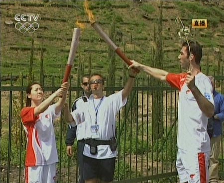 中新網(wǎng)3月24日電 北京奧運(yùn)圣火在希臘成功采集,火炬?zhèn)鬟f開(kāi)始進(jìn)行。希臘境內(nèi)參與火炬?zhèn)鬟f的、來(lái)自?shī)W運(yùn)東道國(guó)中國(guó)的羅雪娟從火炬手亞歷山大•尼克拉澤斯手中接過(guò)火炬,成為奧運(yùn)火炬接力的首位華人。