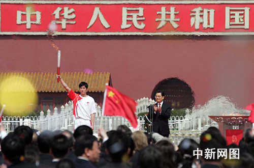 胡錦濤宣布,北京2008年奧運會火炬接力開始。
