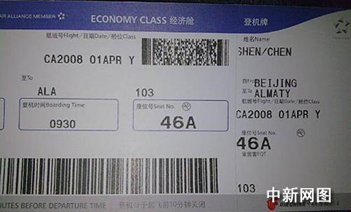 奧運(yùn)包機(jī)機(jī)票登機(jī)牌,航班號顯示為CA2008。攝影:沈晨