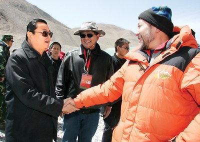 “同志們辛苦了!我代表自治區(qū)黨委、政府向同志們表示慰問和感謝,并向大家致以崇高的敬意。”郝鵬與官兵們一一握手!盀槿嗣穹⻊!”聽著官兵們整齊一致、鏗鏘有力的回答,郝鵬十分欣慰,他勉勵大家一定不辜負祖國和人民的重托,堅決做好北京奧運會火炬登頂珠峰安全保障工作,決不讓分裂分子的陰謀破壞活動得逞。