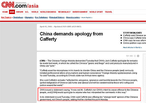 在CNN網(wǎng)站首頁(yè)中部的“Popular News”欄目中,刊登了《China demands apology from Cafferty(中國(guó)要求卡弗蒂道歉)》一文。文章前三段陳述了中國(guó)外交部對(duì)卡弗蒂言論的指責(zé)及要求卡弗蒂道歉的情況,在第四段中這樣說(shuō):CNN發(fā)表了一份聲明稱:“不論是卡弗蒂先生本人,還是CNN,都無(wú)意冒犯中國(guó)民眾;在這里,我們?cè)赶蚴艿酱搜哉撚绊懙娜藗兊狼浮!?/p>