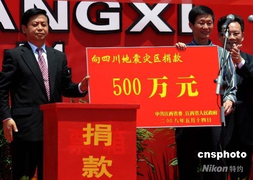 5月14日,奧運圣火瑞金傳遞結(jié)束慶典儀式后,中共江西委副書記王憲魁(左)代表江西省委省政府向四川災區(qū)人民捐款500萬人民幣。 中新社發(fā) 廖攀 攝