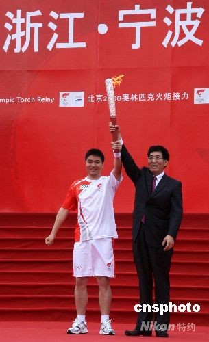 5月22日,舉國(guó)哀悼四川汶川大地震遇難同胞三天后,北京奧運(yùn)圣火在寧波繼續(xù)傳遞。圖為第一棒火炬手竺士杰從寧波市委書記巴音朝魯手中接過火炬。 中新社發(fā) 周兆軍 攝