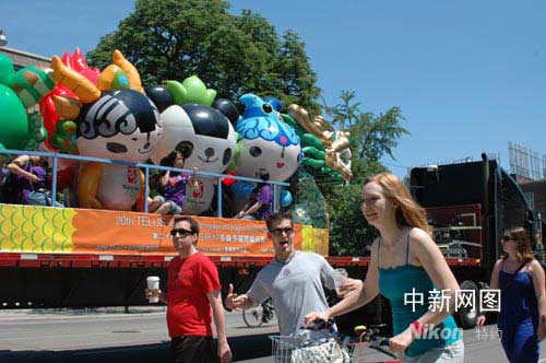 北京奧運吉祥物“五福娃”參加第20屆多倫多國際龍舟節(jié)花車巡游。